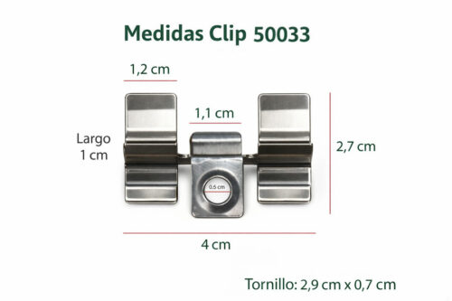 | 30033 | Clips de Acero Inoxidable | 1 cm x 2,7 cm x 4 cm | 100 unidades |