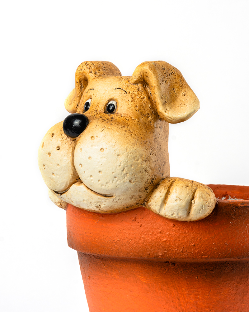 Llena tus espacios de ternura y alegría con este encantador macetero de perro, fabricado en poliresina de alta calidad. Su diseño muestra a un simpático perrito asomándose desde el interior de una maceta tipo terracota, con una expresión dulce y divertida que lo convierte en una pieza decorativa ideal para cualquier rincón.