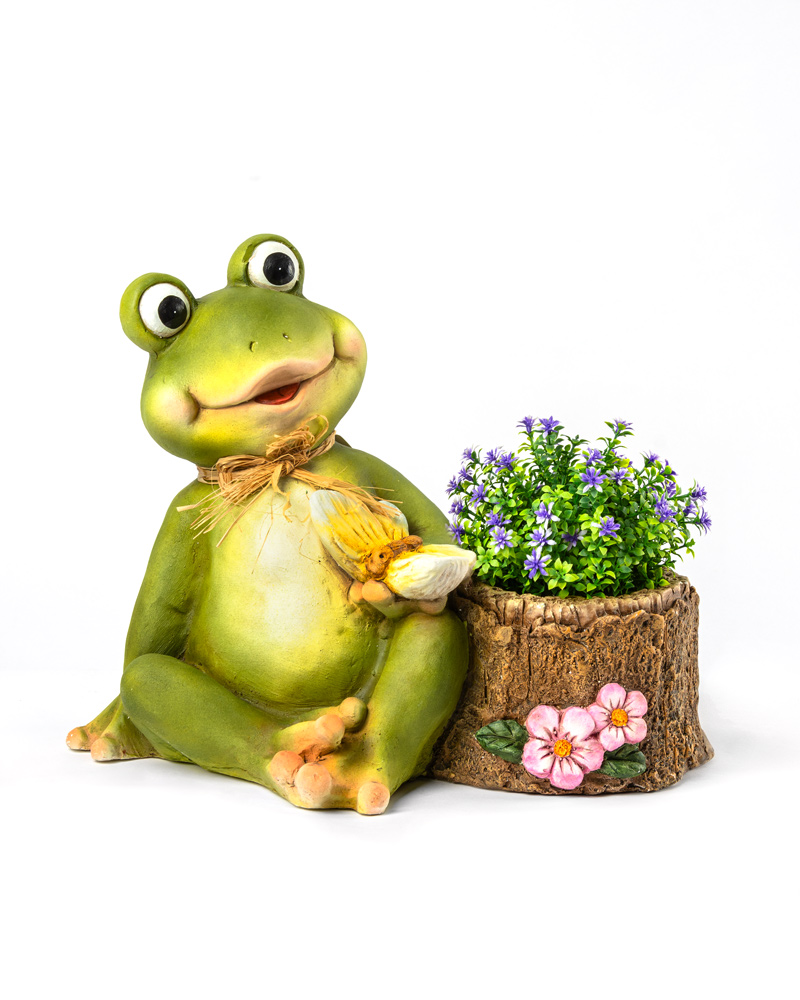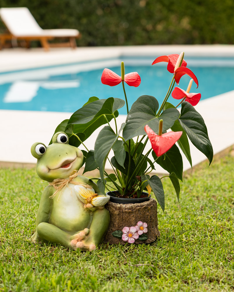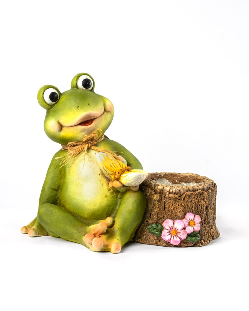 Macetero decorativo de poliresina con diseño de rana junto a un tronco floral. Ideal para jardín, terraza o interiores. Resistente, duradero y perfecto para plantas pequeñas o suculentas.