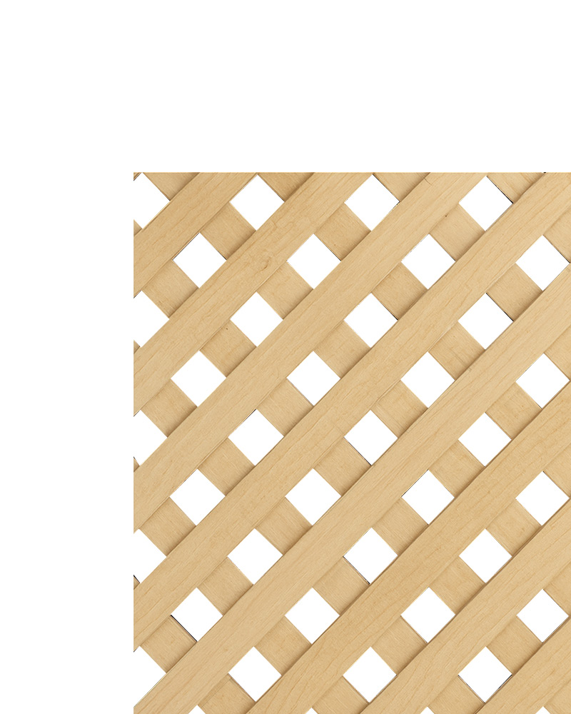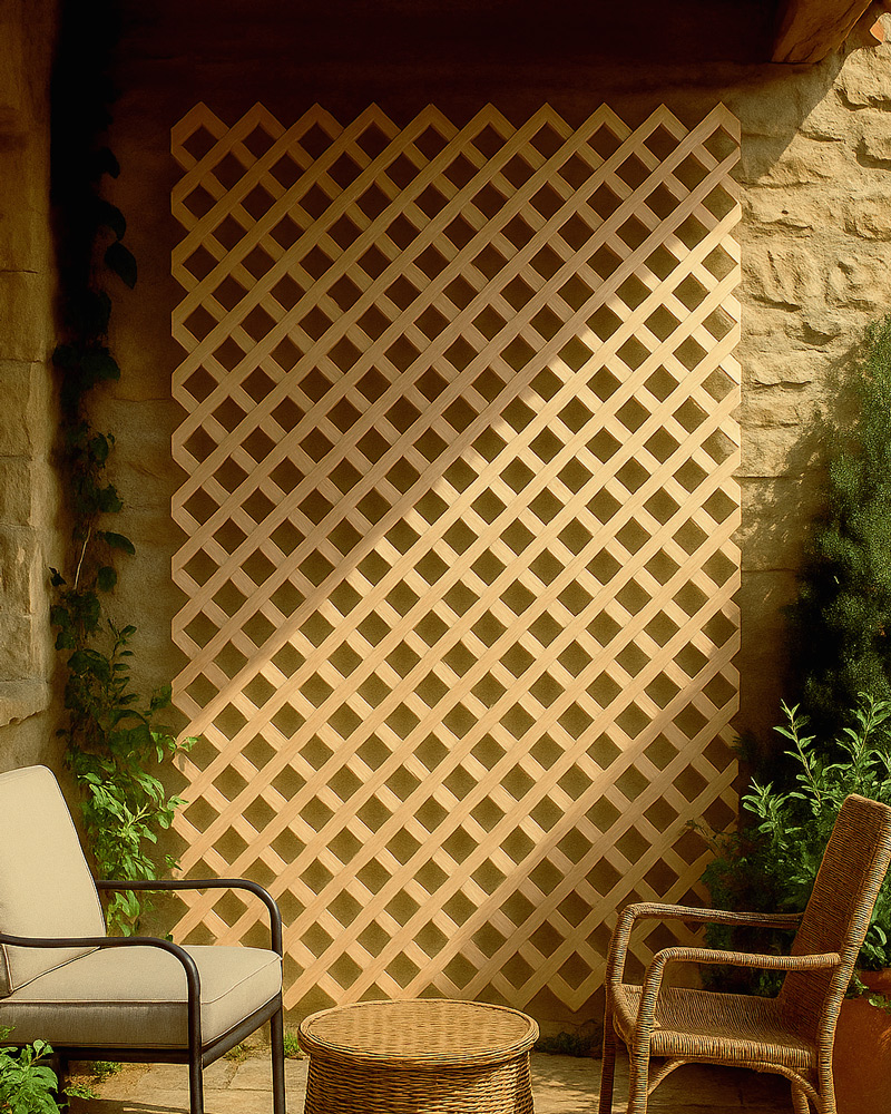Panel de celosía sin marco fabricado en madera maciza de abeto, ideal para aportar un toque cálido, natural y elegante a patios y jardines. Tratado para uso exterior y fácil integración decorativa.