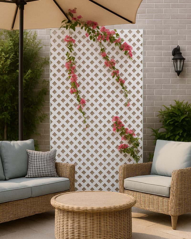 Panel de celosía sin marco de uPVC, ideal como separador de ambientes y elemento decorativo. Resistente a la intemperie, duradero y de fácil mantenimiento, perfecto para interiores y exteriores.