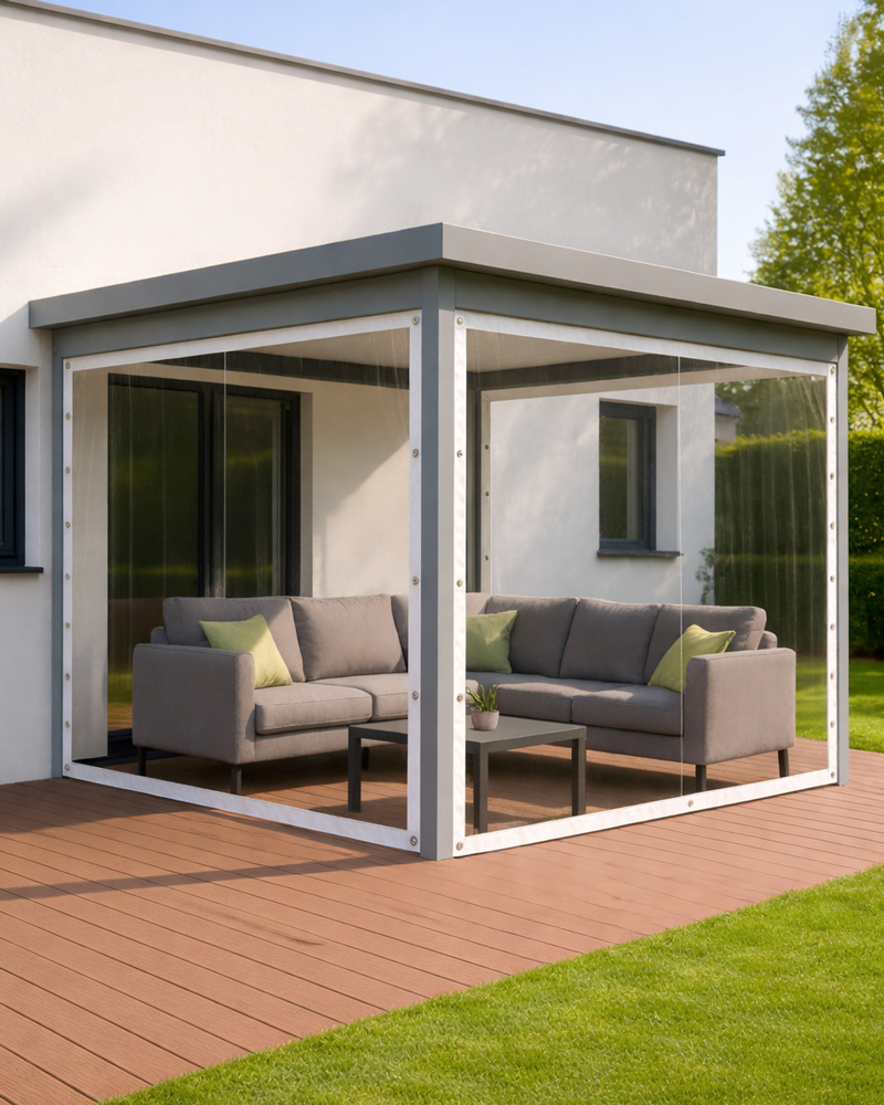 Toldo transparente reforzado en PVC con protección Anti-UV. Ideal para balcones, terrazas y pérgolas, protege de lluvia y viento sin reducir la iluminación natural.