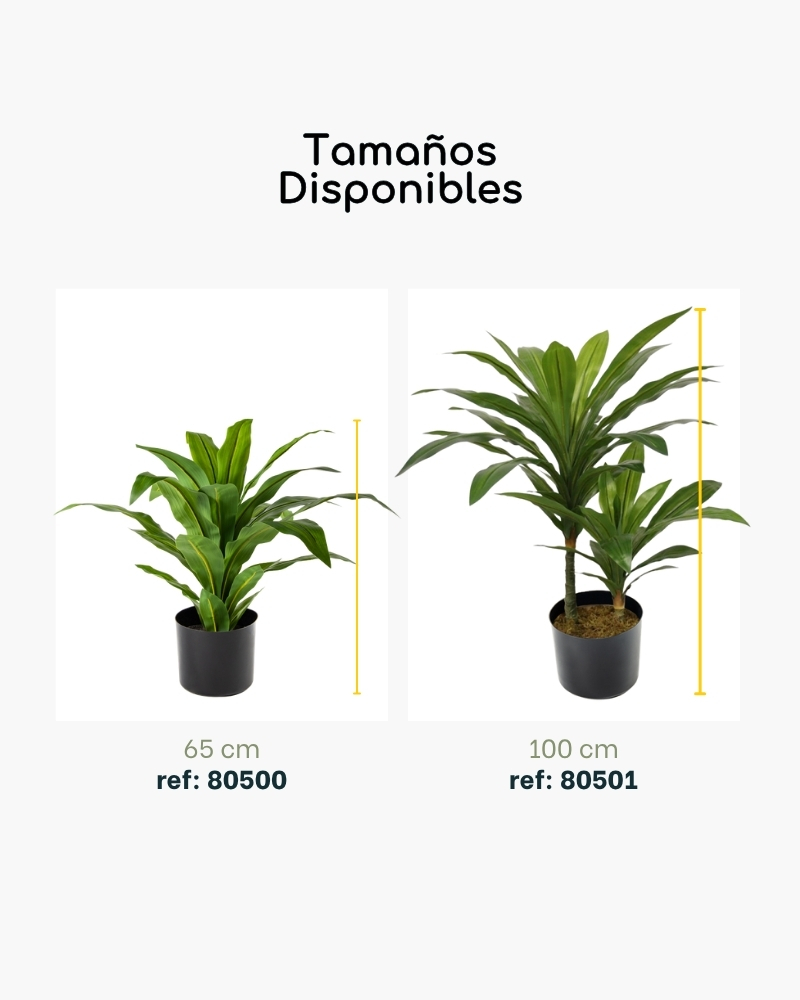 Planta artificial tipo Drácena disponible en 65 cm y 100 cm. Realista, decorativa y sin mantenimiento. Perfecta para interiores y lista para colocar.