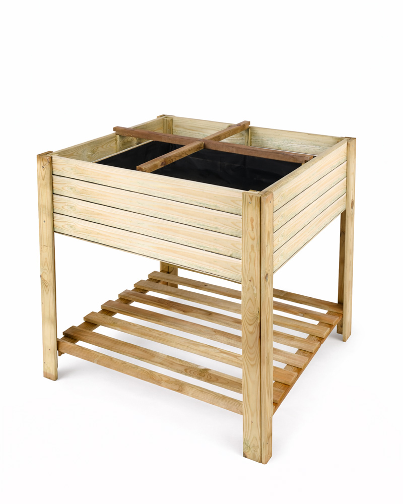 Fabricado con pino silvestre de alta calidad y tratado con el sistema de autoclave, este huerto urbano garantiza una gran resistencia a la humedad, al desgaste y a las inclemencias del clima, asegurando su durabilidad en exteriores. Además, incluye una malla geotextil que cubre el depósito del modelo, mejorando el drenaje y protegiendo el sustrato de la erosión. Esta malla es esencial para mantener las raíces de las plantas saludables y garantizar un crecimiento adecuado.