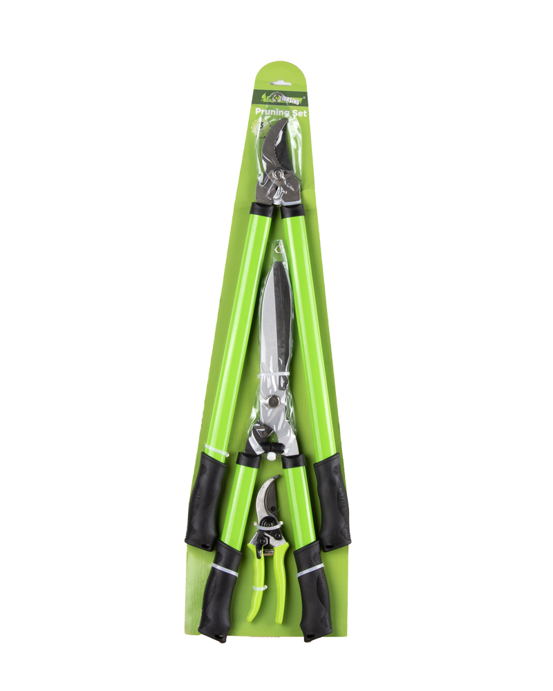 Set de poda 3 piezas: tijeras de podar 61 cm, tijeras para cercas 53 cm y tijeras de podar 20 cm. Cuchillas resistentes y mangos ergonómicos. Ideal para el mantenimiento completo del jardín.